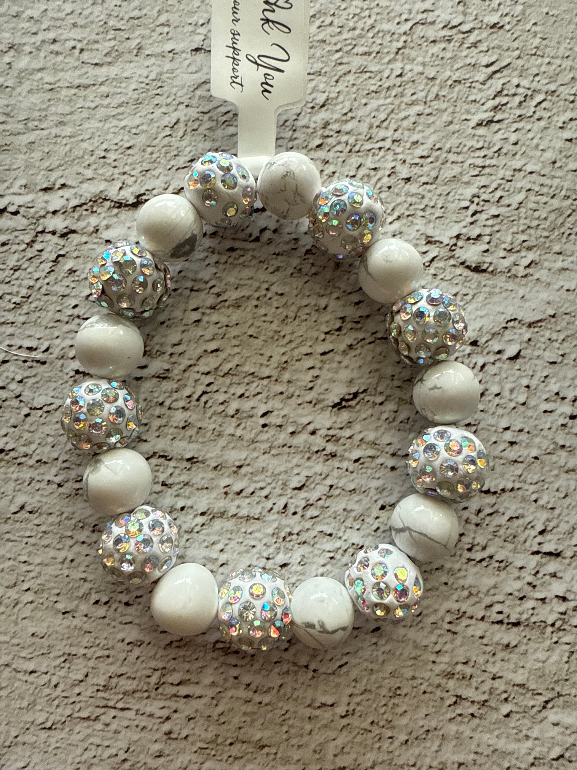 Dieses elastische Armband wurde speziell für Kinder im Alter von 6 bis 12 Jahren entworfen. Es vereint glitzernde Schmucksteine mit sanftem Howlith – eine Kombination aus Leuchtkraft und innerer Ruhe.