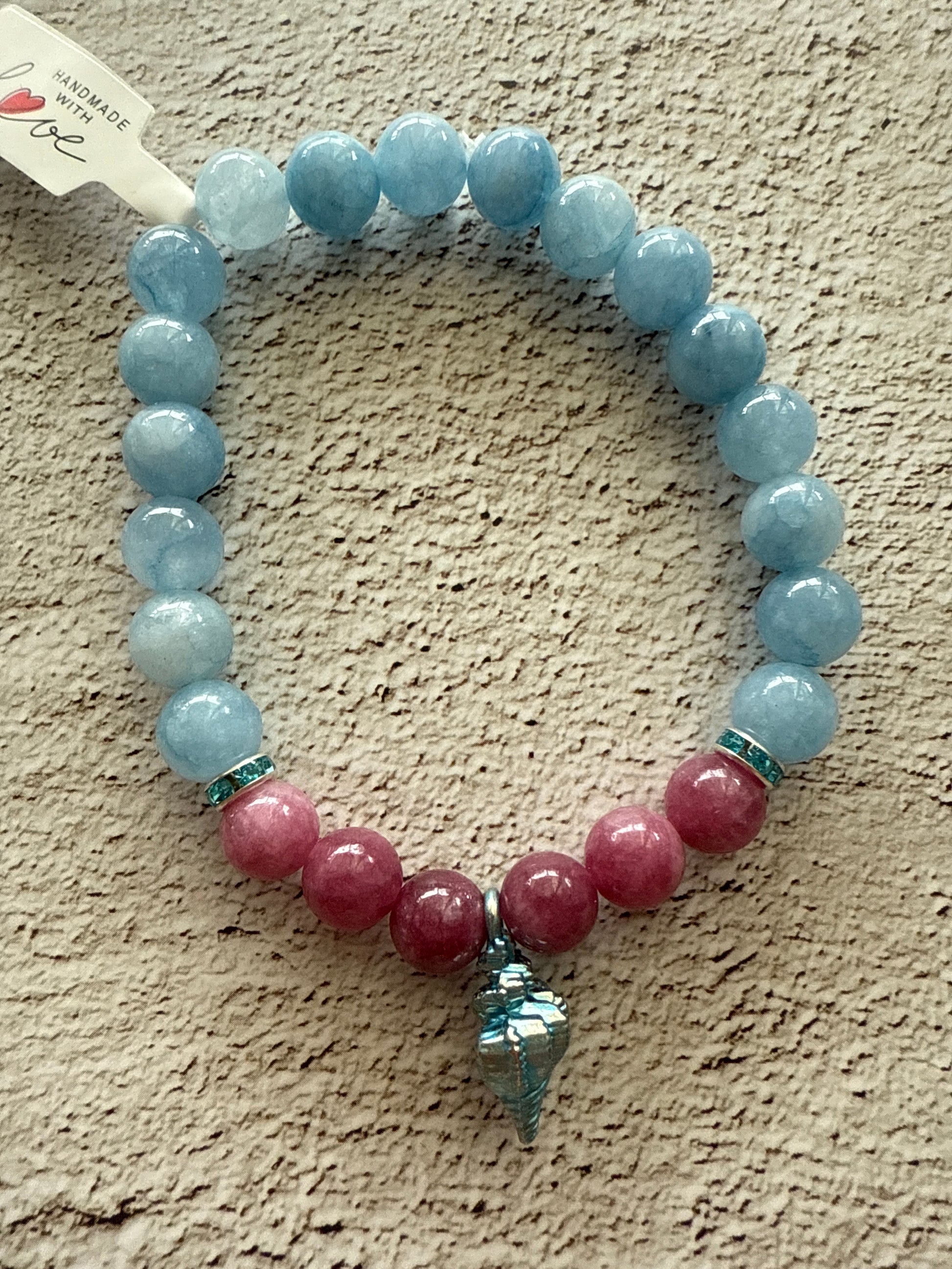Dieses elastische Armband in Größe M verbindet sanften Aquamarin, kraftvollen Granat und eine schimmernde Muschel in Blau – ein einzigartiger Mix aus Ruhe, Stärke und innerem Kompass.