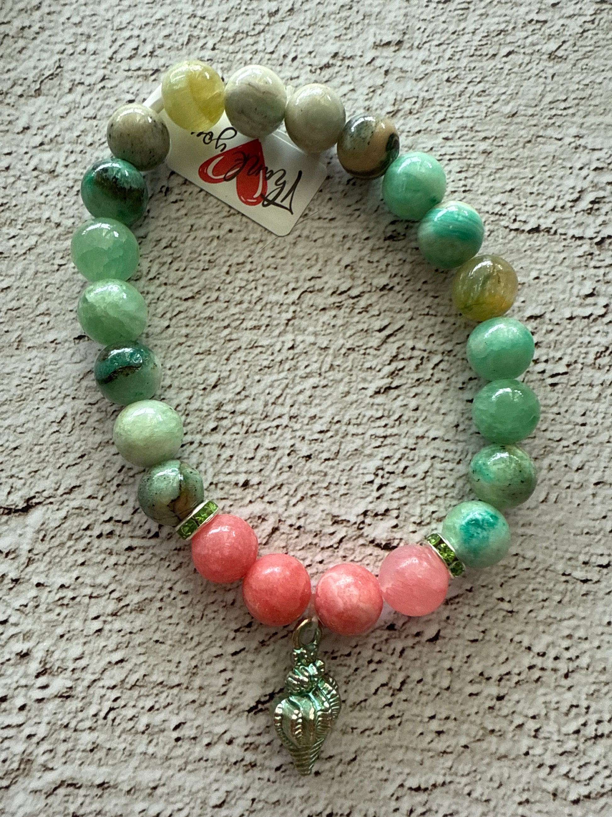 Dieses elastische Armband in GrĂ¶ĂŸe M kombiniert kraftvollen Phönixstein mit einem schimmernden Muschel-AnhĂ€nger in GrĂŒn – eine Verbindung aus innerem Aufbruch und tiefer Ruhe.