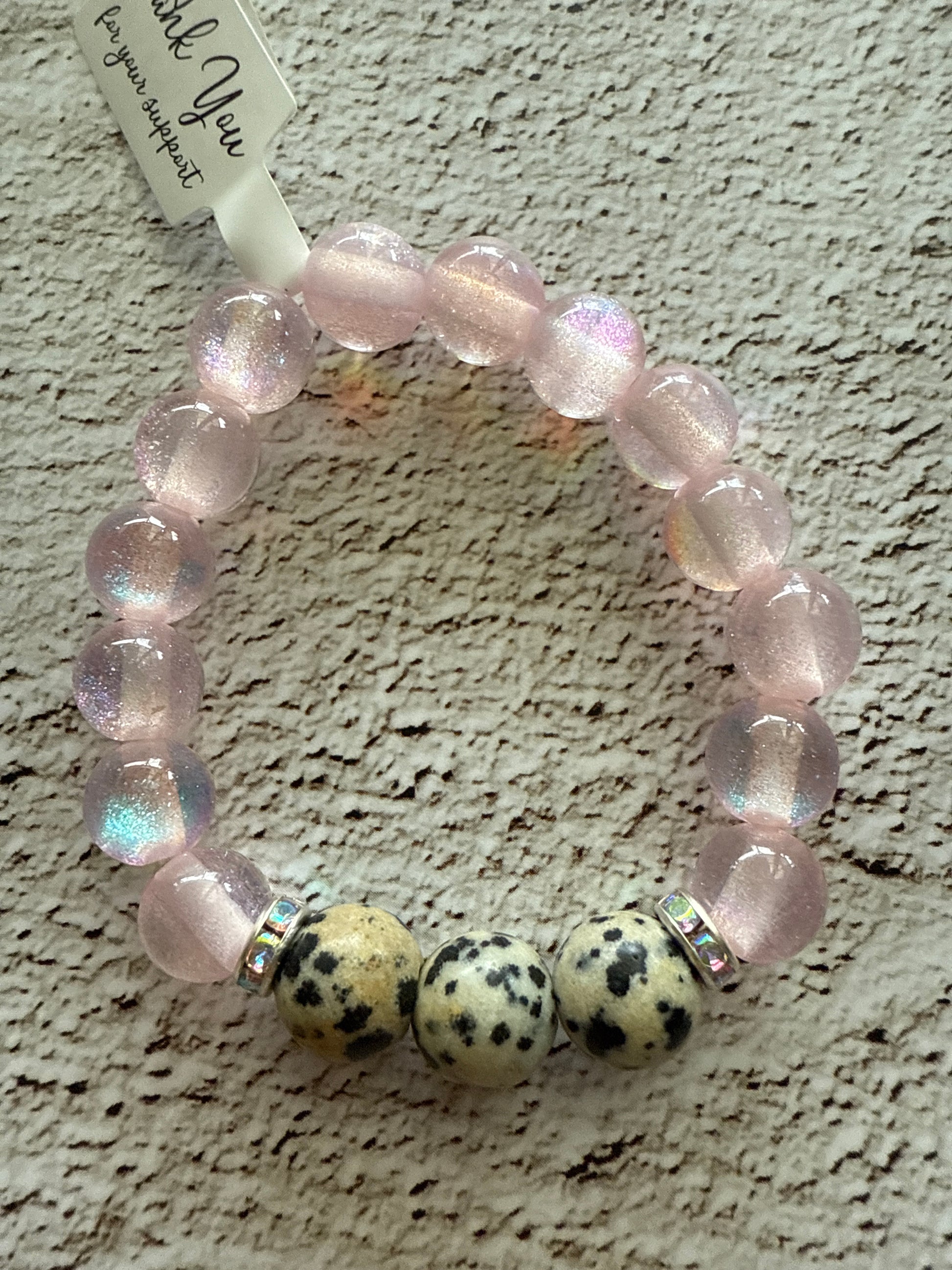 Dieses elastische Armband wurde liebevoll für Kinder zwischen 6 und 12 Jahren gefertigt. Es kombiniert rosa Schimmerperlen, Dalmatiner Jaspis und feine silberne Glitzerakzente – eine Mischung aus Spaß, Schutz und ganz viel Persönlichkeit.